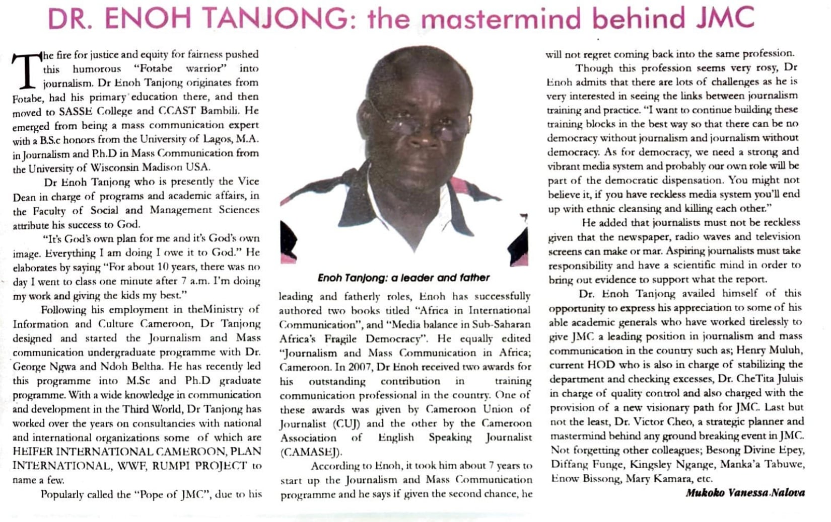The fire for justice and equity for fairness pushed this humorous “Fotabe Warrior” into journalism. Dr Enoh Tanjong originates from Fotabe, had his primary education there, and then moved to SASSE College and CC.AST Barnhill. He emerged from being a mass communication expert, with a B.Sc. honours from the University of Lagos, M.A. in Journalism and P.h.D in Mass Communication from the University of Wisconsin Madison, USA.